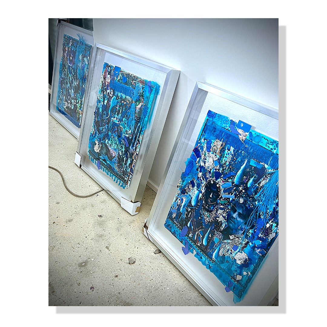 A series of three artworks created doing various summers in the Cycladic Islands, Greece.  Many of the collage elements are found objects (in blue tones) from the surrounding areas.