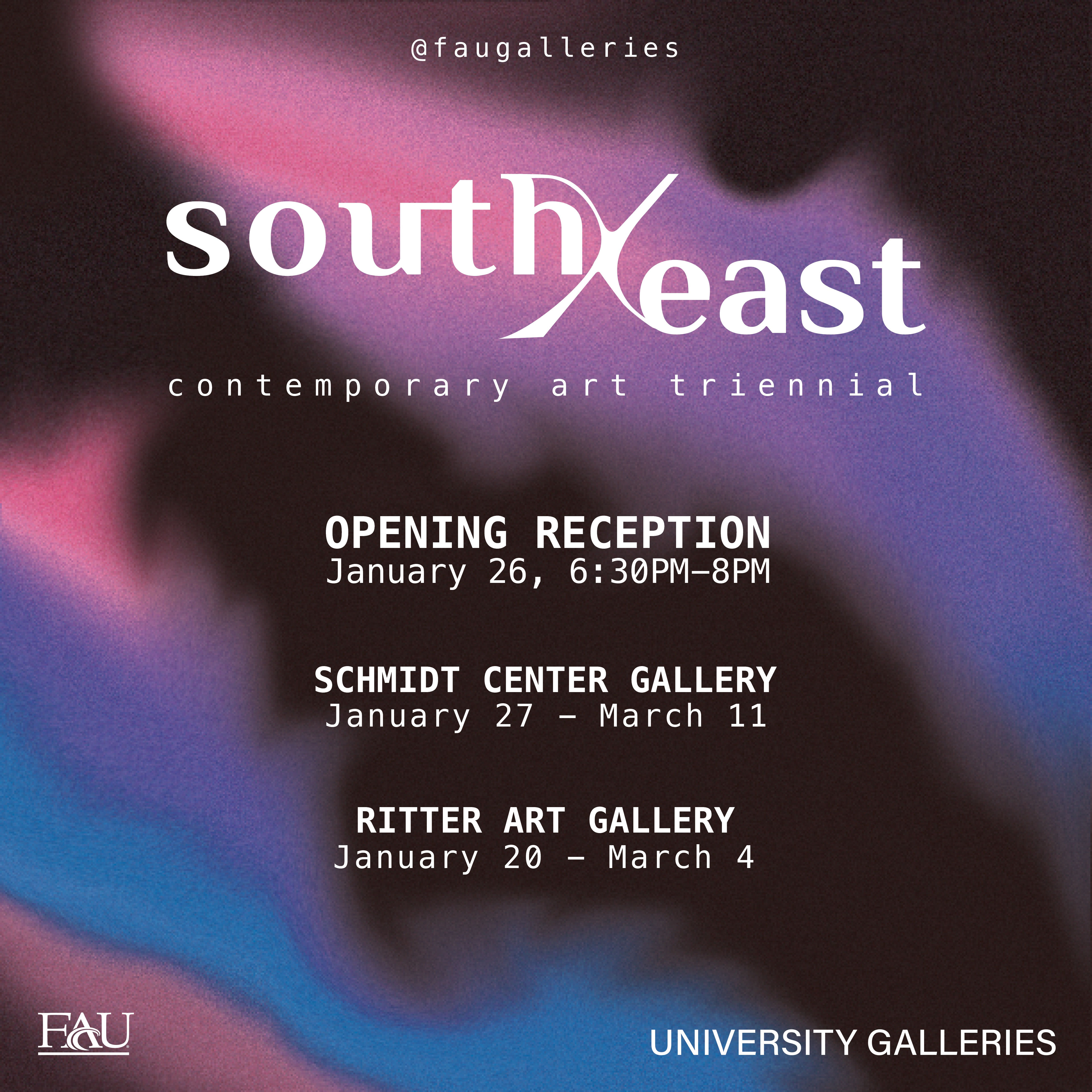 The 6th southXeast: contemporary art triennial follows a legacy initiated by retired director Rod Faulds in 2005 at Florida Atlantic University. Curated by Veronique Cote, this display of regional talent is created through the team efforts of FAU student workers and recent graduates.As a professional training ground for future museum workers, the Galleries are proud to promote a culture of inclusivity and genuine southern welcome. This year’s production highlights an impressive roster of thirty artists selected through referrals from various regional institutions across the southeastern United States.