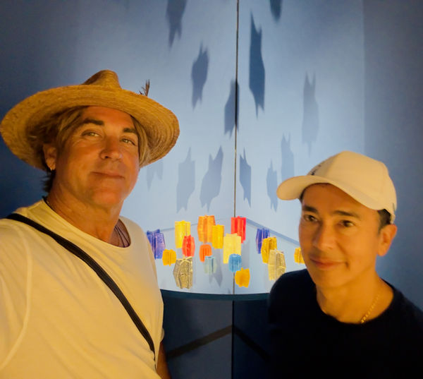 The Puerto Rican artists' Carlos Betancourt and Alberto Latorre are phographed here with their artwork and the Prince of Monaco, his Serene Highness Prince Albert II during a meeting with the monarch and son of Princess Grace Kelly and Prince Rainier III The artists are currently based between Miami, Mexico and Greece. The artwork in this picture are sculptural prototypes of the artist's iconic collaboration The Reef Star.