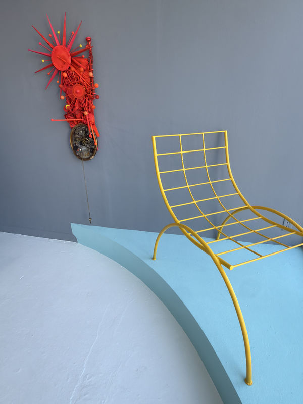 La Silla Centrust presents the skeletal frame of a chair, its seat and back removed and the structure painted a uniform yellow. The curve of the backrest subtly mirrors the distinctive arc of the former Centrust Bank tower in Miami, designed by I. M.