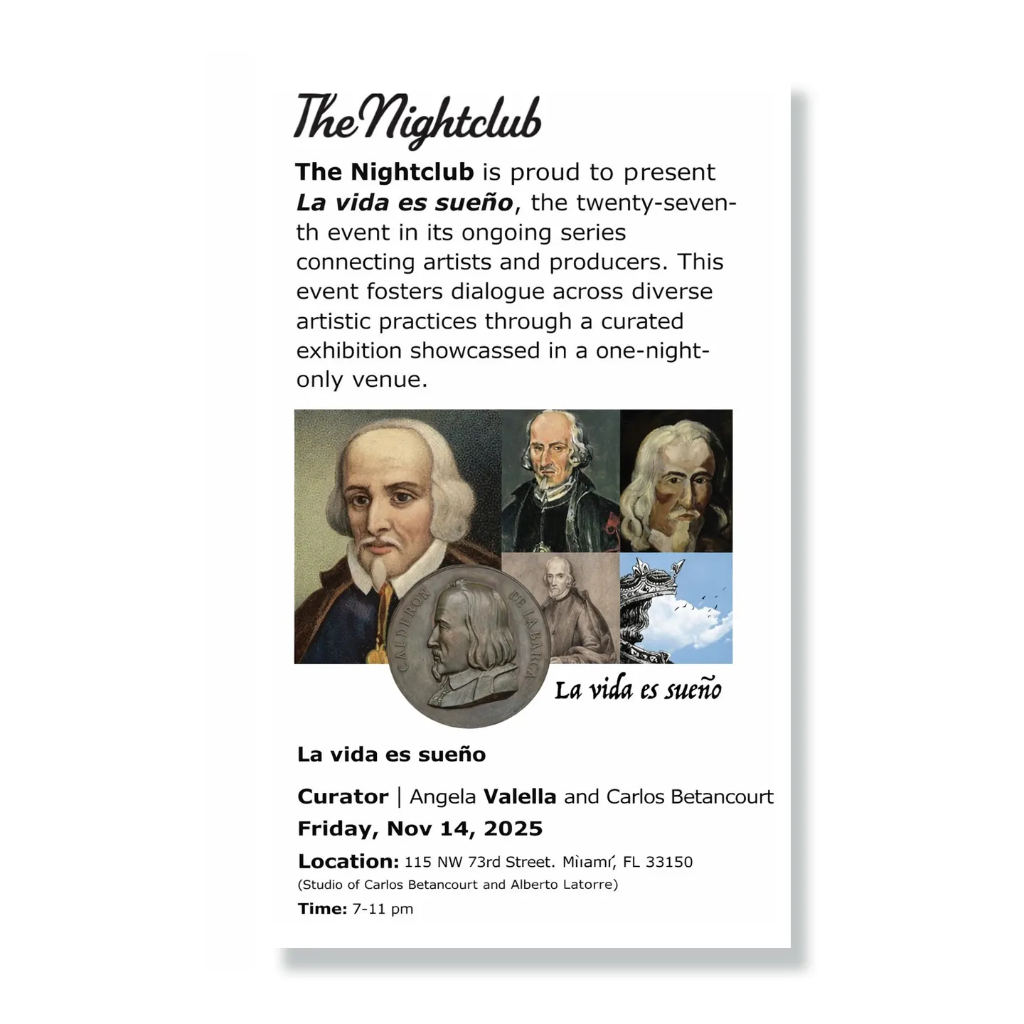 The Nightclub is proud to present La vida es sueño, the twenty-seven-th event in its ongoing series connecting artists and producers. This event fosters dialogue across diverse artistic practices through a curated exhibition showcassed in a one-night-only venue.